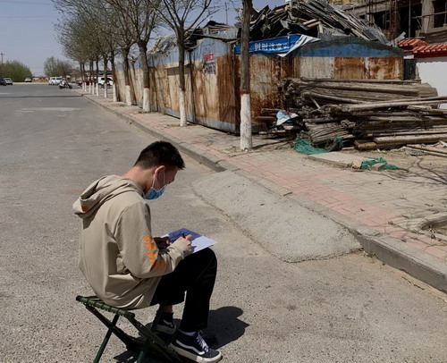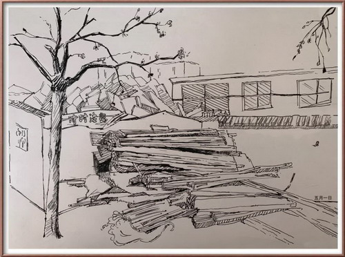 “疫情逐步接近尾声,天气也渐渐变暖起来。我迈出了步伐,拿起了画笔,选择正在修建房屋附近的一堆废弃物作为写生对象,若干木头和后面的铁皮、房屋层层叠叠,新建的房子与废弃物映入眼帘,让我想起了生命的轮回,勾起了我对艺术创作的思考,不就应该在不断的否定和尝试中努力创新和发展吗?”