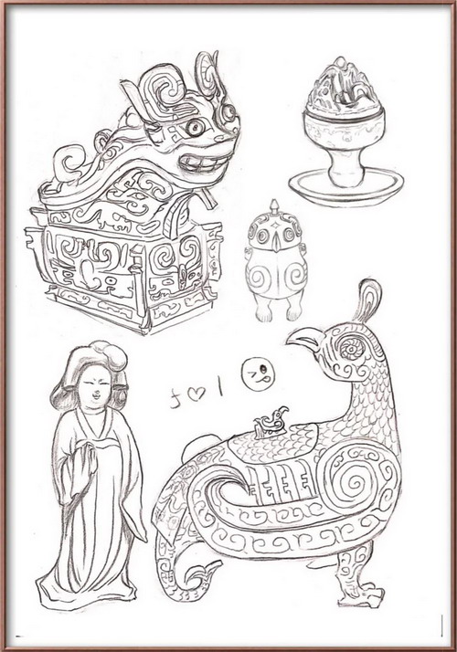 “文物是沉淀的历史,不仅要用眼睛看,也要用笔去触摸,用心去感受。我在沉下心来写生时,会注意到更多细节,仿佛置身于时间的汩汩长河,耳边是晨钟暮鼓,心中充满宁静。非常惊喜的是博物馆年前的特别展览还没有结束,再一次大饱眼福,不过特殊时期大家也一定要注意防护呀!”