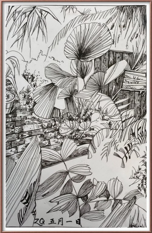 “这片美景是我在家附近艺术区发现的,在城市的一角有这样宁静的风景,值得人为它驻足。写生作品画面呈竖构图,整体风格偏设计、装饰感,用线条赋予它新的生命,突出绿植纹理。不经意间发现惊喜,生活难道不值得我们去欣赏吗?”