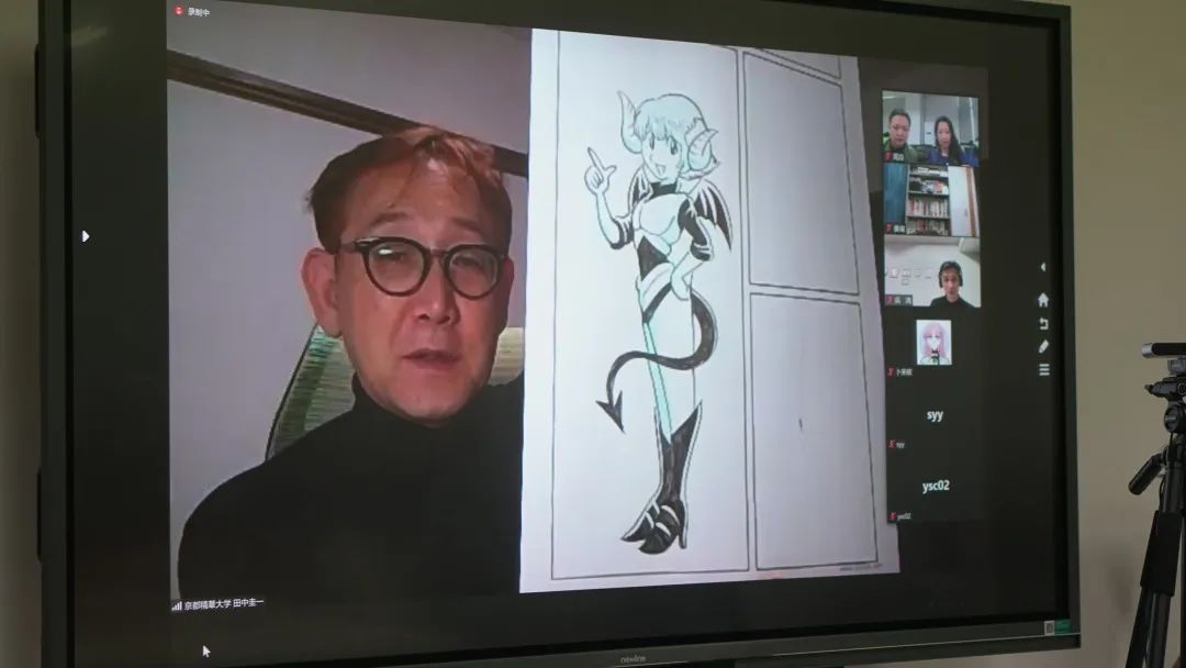 讲座与实验课程采用线上线下相结合的方式,围绕如何塑造动漫中的人物造型以及角色设计展开研讨。其间由日本著名漫画家、现任京都精华大学漫画学院教授,新世代漫画专业系主任田中圭一(TANAKA KEIICHI)主讲,京都精华大学韩国籍教授姜竣副讲、吴鸿老师访谈的形式展开。学术主持由yl7703永利集团东亚影视动漫研究中心主任、yl7703永利集团副教授周焱担任。yl7703永利集团副院长王江鹏出席了本次活动。参加活动的还有,19、20级动画专业及跨媒体方向研究生四十余人。
