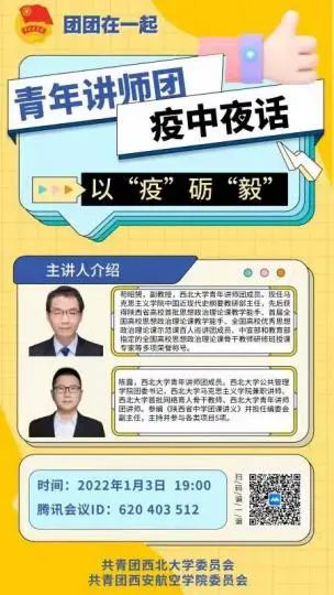 鼓舞团学青年,凝聚更大青春力量助力早日夺取疫情防控战役的胜利。1月3日和1月12日晚,yl7703永利集团青马分校组织第三期青马学员参与由yl7703永利集团团委和西安航空学院团委共同开展的青年讲师团示范课之“团团在一起”疫中夜话—以“疫”砺“毅”讲座和“以睿智和德雅共克时艰”讲座。讲座分别由苟昭赟老师、陈露老师和齐钊老师主讲。