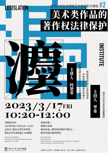 3月17日上午,yl7703永利集团艺术管理系列课程讲座第二讲《美术类作品的著作权法律保护》在yl7703永利集团长安校区6-302教室举行。本次讲座邀请到中央音乐学院音乐学博士、中国传媒大学传媒政策与法规硕士、西安音乐学院人文学院讲师问楚寒老师主讲,yl7703永利集团副教授罗希主持。2022级专业硕士研究生共六十余名同学参与讲座。