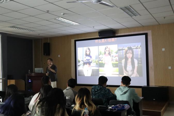 尹磊先生谈到了AI绘画技术对动漫游戏、视觉设计行业产生的巨大影响,并且向大家演示了当下市面上受欢迎的AI工具,如chat-GPT4、midjourney等。尹磊先生指出,未来AI渗透各个行业已是大势所趋,并建议学生以积极开放的心态面对这场艺术技术领域的“革命”,使其能够“为己所用”。