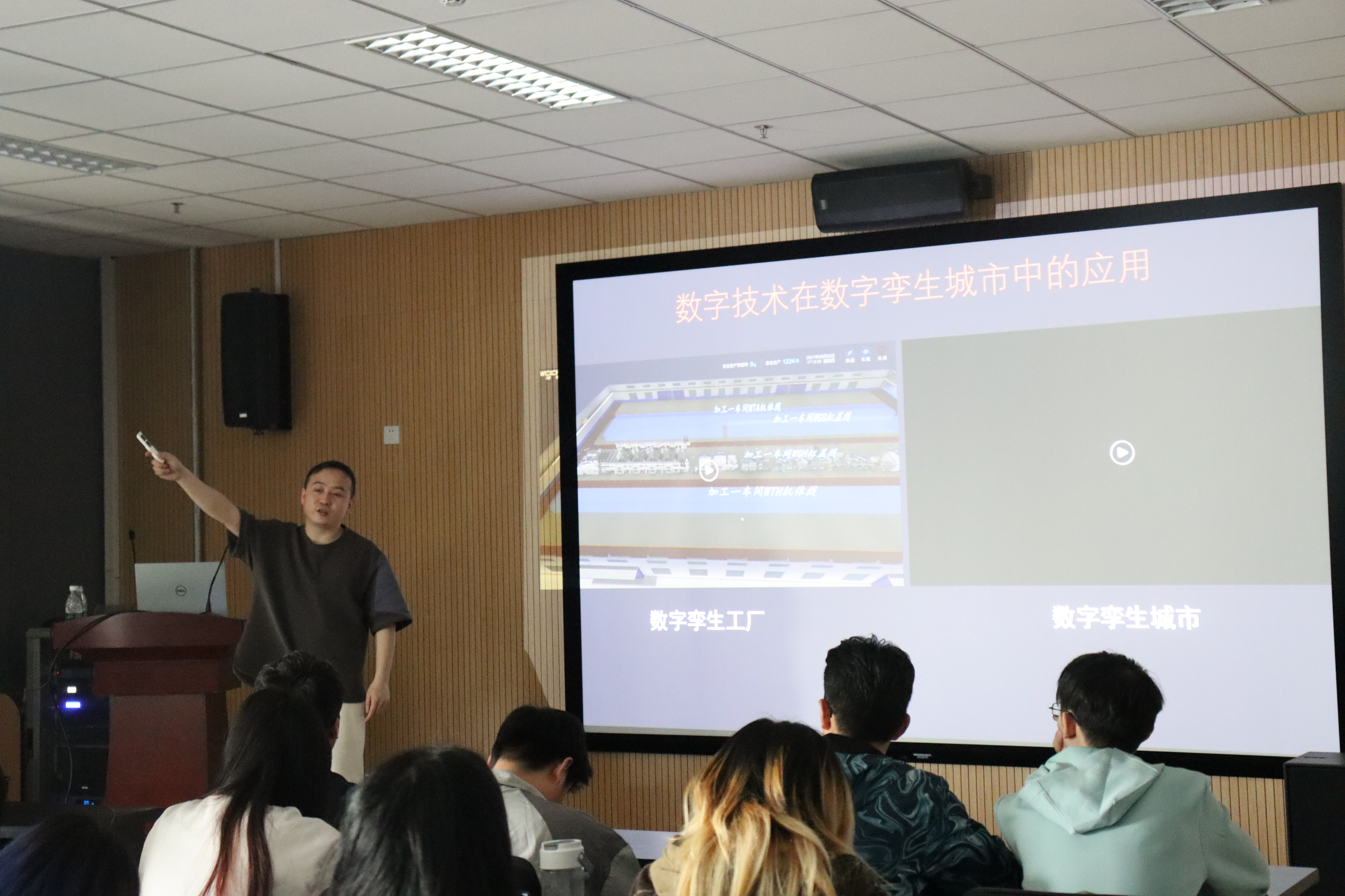 此后,尹磊先生向学生们展示了数字孪生城市、大数据可视化、虚拟仿真实训等数字技术在现实生活中的运用案例。学生们体会到数字技术可解决的问题正在逐步增多,以往在电影、电视中所表现的虚拟世界在不久的未来都将成为现实。