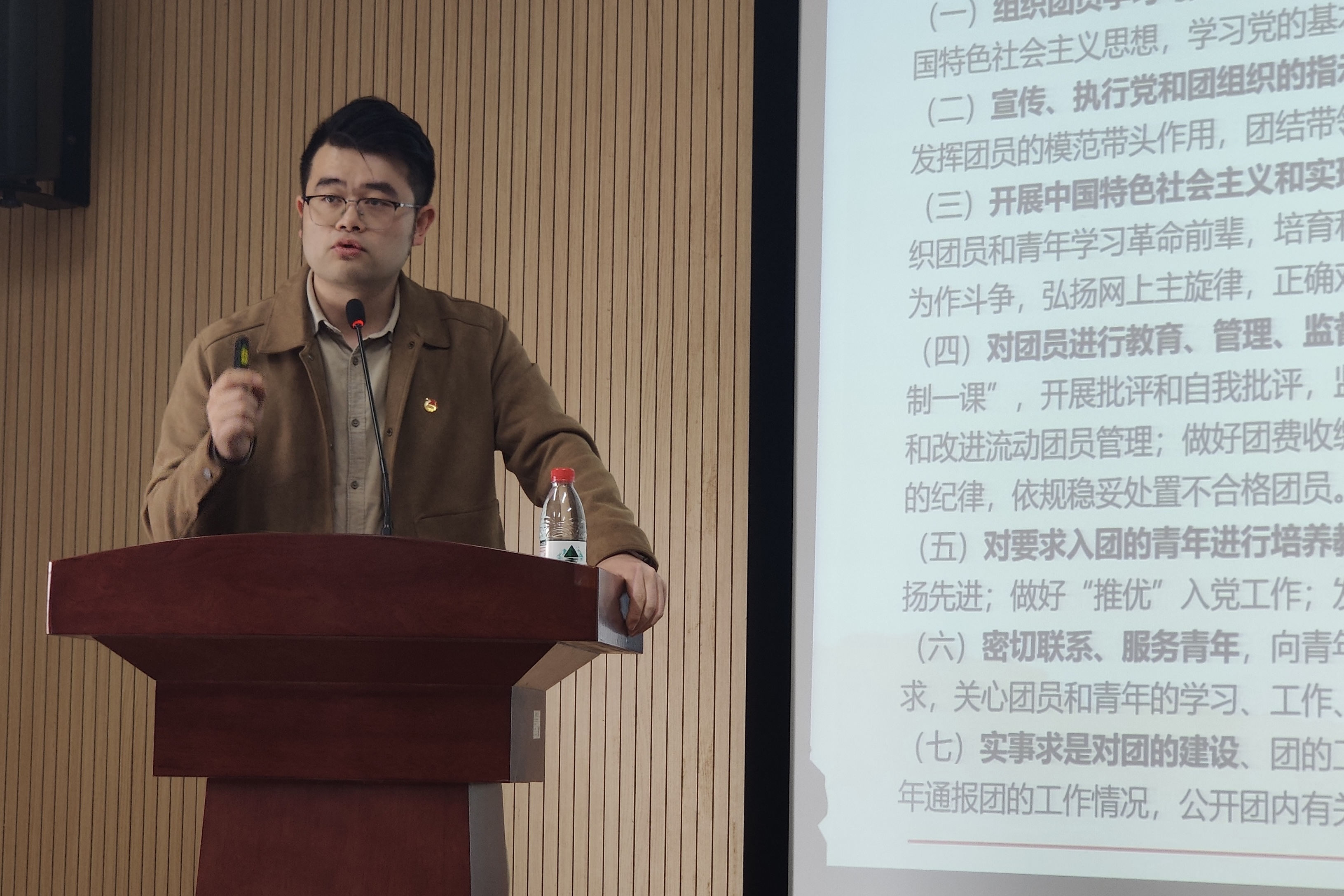 邹老师先后从团支部建设、团支部工作手册的使用、智慧团建系统、团员发展与推优四个方面详细地向各团支书讲解了团支部工作。他对团支部成立条件、要求及团支部的重点工作任务、班团一体化运行机制、推优流程等问题进行详细介绍,并结合学校各团支部实际运行情况就团支部工作手册撰写和“三会两制一课”开展中存在的问题进行讨论分享。此外,邹老师就各位团支书在开展相关工作的过程中,如何减少工作失误、提高工作效率、改进工作方式等方面提出了切实可行的方法建议。