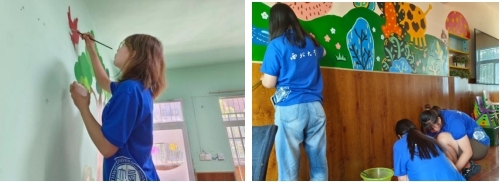 7月14日,实践队采购工具画材等用品,来到碑林区晶洁鸟特艺调理阳光家园,展开绘画墙体工作。绘墙工作可分为初步绘制草图、上色和补充细节三个阶段。16日上午,经过队员们积极讨论、互相配合,墙体绘制工作顺利完成。一个个栩栩如生的小动物图案吸引着智力残障“儿童”们的目光,在他们心中种下希望和友爱。