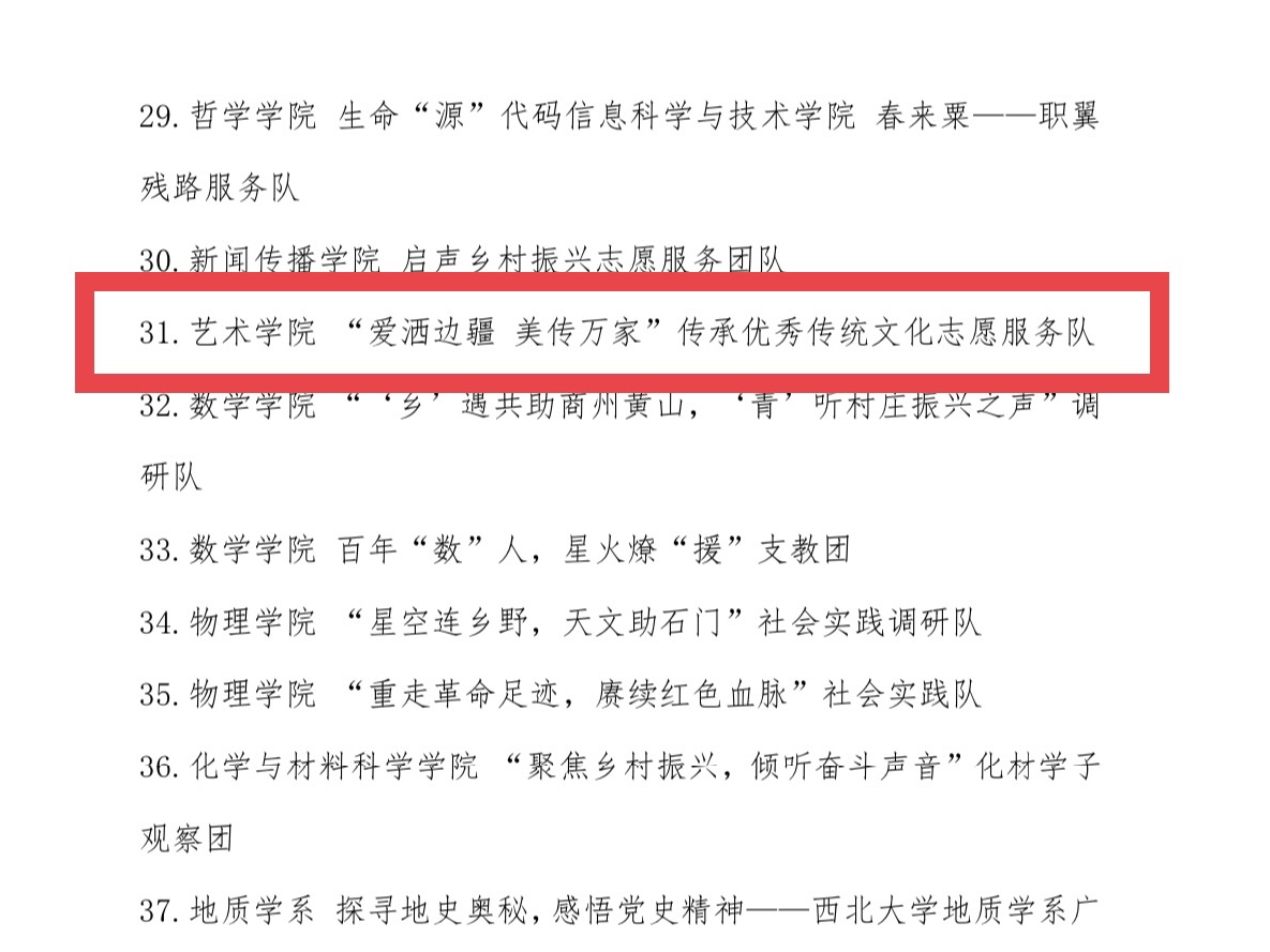 此外,“爱洒边疆 美传万家”传承优秀传统文化志愿服务队在中国青年报社主办的2023大学生社会实践成果“千校千项”网络展示活动中入选项目优秀名单。