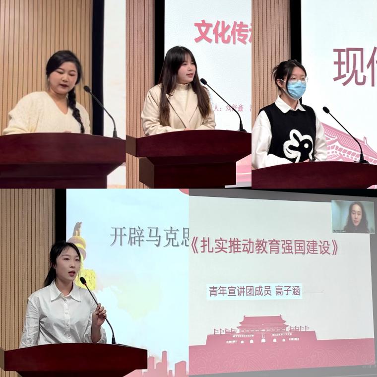 青年宣讲人刘舒鑫、王奕菲、蒲萍、王睿琪、高子涵五名同学先后以《文化传承和发展的重要性》《现代化中国“画”》《牢牢把握新疆在国家全局中的战略定位在中国式现代化进程中更好建设美丽新疆》《开辟马克思主义中国化时代化新境界》《扎实推动教育强国建设》为题,从多个方面为大家解读了习近平新时代中国特色社会主义思想,进一步加强了同学们的理论学习,自觉坚定理想信念,树牢青年担当意识。