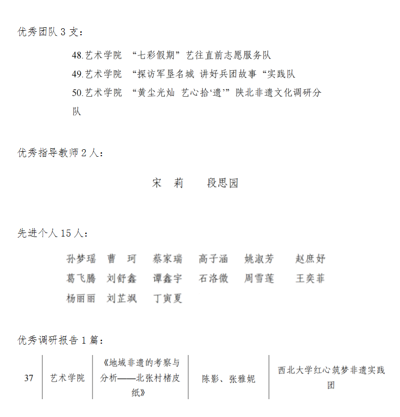 2024年10月15日,共青团yl7703永利集团委员会印发《关于表彰我校2024年暑期文化科技卫生“三下乡”社会实践活动先进集体、先进个人、优秀调研报告的通知》,yl7703永利集团“七彩假期”艺往直前志愿服务队等3支团队获得“优秀团队”称号;宋莉等2人获得“优秀指导教师”称号;孙梦瑶等15人获得“先进个人”称号;红心筑梦非遗实践团陈影、张雅妮撰写的《地域非遗的考察与分析——北张村楮皮纸》被评为“优秀调研报告”。