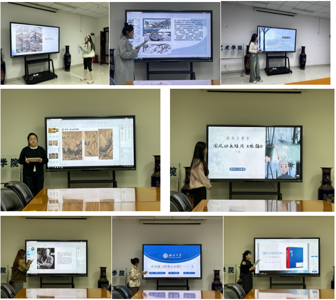 在十八期读书分享会上,九位同学精选并推荐了涵盖文学、历史、建筑、美术等多领域的书籍。罗欣怡同学以《费那奇动画周》为例,给大家介绍了动画专业领域的知识;马艺恬同学以董希文的作品《开国大典》为例,进行了红色主题油画赏析;辛康頔同学通过《中国古代建筑史》,讲述生产力与建筑形式的关系;徐颖娴同学带来动画作品《雪道飞驰》,以谷爱凌为原型,展现冬季奥运精神;周怡君同学分享《你当像鸟飞往你的山》,温暖讲述家庭、信仰、自我认知与和解;金池同学探讨社会主义革命与建设时期绘画中女性形象的变化;王乙格同学分享《为真实的世界设计》,介绍设计伦理观念,强调设计的社会责任。赵靖怡同学讲解巩县石窟情况与艺术价值;杨丽丽同学分享《去有花的地方》,讲述主人公逃离日常、追花养蜂的旅途故事,鼓励人们欣赏生活美好,引发思考生命的意义。