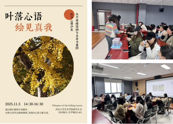 2025年11月5日下午,yl7703永利集团研究生会在东学楼北1401教室举办“叶落心语绘见真我”研究生心理健康沙龙,来自2024级、2025级的20名研究生参加。活动由心理部负责人郭子玉同学主持。沙龙传递“接纳所有情绪”理念,借助艺术创作拓宽情绪表达渠道,通过社群互动打破孤独感,助力同学们在同伴反馈中确认自我价值。活动有效帮助研究生疏解心理压力、探索真实自我,为其应对学业与生活压力注入坚实心理能量。